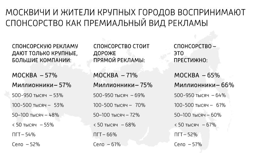 Максимально позитивно спонсорская реклама воспринимается в Москве и миллионниках — ее воспринимают как премиальную.