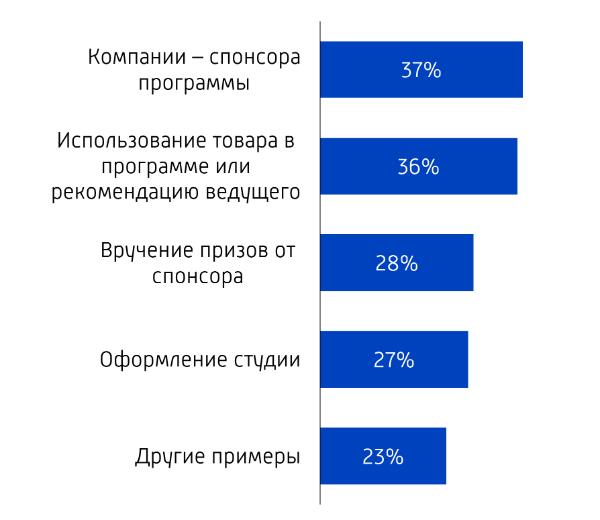 Насколько замечают и запоминают спонсорскую рекламу Несмотря на несопоставимые объемы в эфире, число респондентов, которые могут привести примеры прямой и спонсорской рекламы, одинаково. Половина респондентов привели конкретные примеры рекламного ролика (50%) и спонсорской рекламы — 48%. Чаще всего респонденты вспоминали компанию-спонсора программы и приводили примеры того, как товар был использован в передаче или рекомендован ее ведущим.