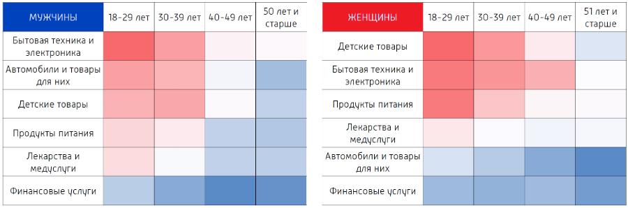 У мужчин и женщин разных возрастов категории товаров, при покупке которых они учитывают увиденную спонсорскую рекламу, различаются.