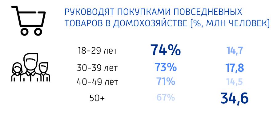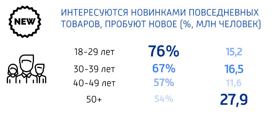 Отдельное внимание эксперты уделили изменениям в поведении аудитории старше 50 лет. В исследовании отмечается, что ответы респондентов этого возраста практически не отличаются от того, что выбирала молодежь среднего возраста. Отношение к товарам у аудитории 50+ меняется только после 70 лет, хотя и среди респондентов этого возраста 49% сообщили, что интересуются новинками и пробуют их.