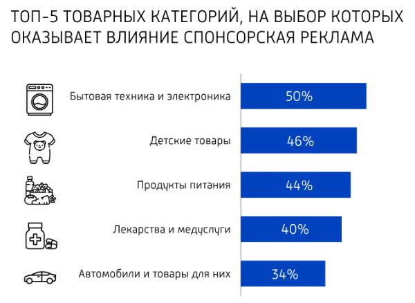 Существуют категории товаров, на выбор которых спонсорская реклама оказывает существенное влияние, отмечают эксперты. В первую очередь это касается бытовой техники (50%), детских товаров (46%).