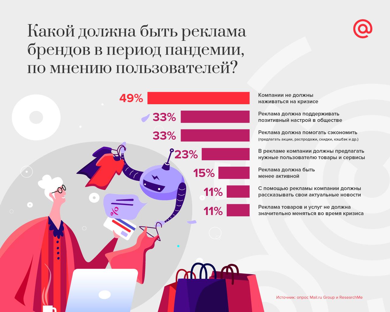 Большинство респондентов — 63% — ценят компании, которые во время кризиса сохраняют качество и цену на приемлемом для потребителей уровне. Каждый второй отмечает, что бренды не должны наживаться на кризисе. Каждый третий ждет от рекламы поддержки позитивного настроя, и столько же хотят, чтобы реклама помогала им экономить. 23% предпочитают видеть рекламу нужных им товаров и сервисов, особенно важно это для пользователей 18–24 лет и старше 55 лет (28% и 27% соответственно).