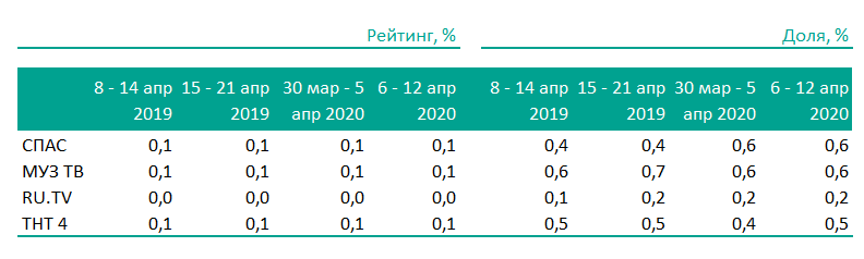Накопленное время просмотра религиозных телепрограмм за неделю с 13 по 19 апреля 2020 г. выросло более, чем в два раза к прошлому году (22–28 апреля 2019 г.) среди населения старше четырех лет в крупных городах, об этом говорится в исследовании Mediascope. В этом году россияне в среднем смотрели такой контент 19 минут, годом ранее показатель составлял 9 мин.