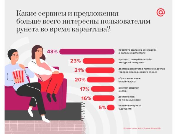 Среди «карантинных» сервисов и предложений наибольший интерес у пользователей Рунета вызвал просмотр фильмов со скидкой. Акции онлайн-кинотеатров привлекли 43% интернет-аудитории, показал опрос Mail.ru Group и ResearchMe.