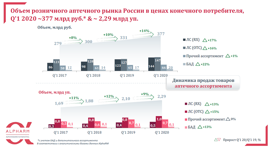 Объем розничного аптечного рынка России в ценах конечного потребителя в первом квартале этого года достиг 377 млрд руб., что на 14% больше к прошлому году. Основной прирост продаж за первые три месяца обеспечил март. Об этом говорится в исследовании AlphaRM, представленном на бизнес-завтраке «Pharma 2020: new reality», организованном Dentsu Aegis Network Russia.