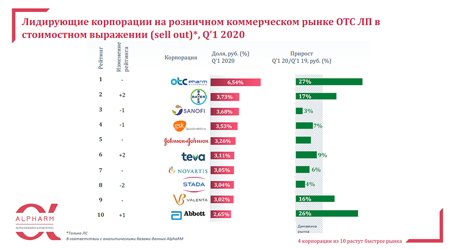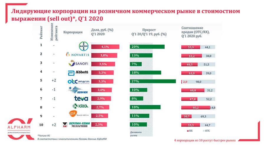 Среди корпораций наибольшую динамику в январе — марте показали «Отисифарм» (+27%), Bayer (+20%), Abbott (+18%), Krka (+18%). В сегменте безрецептурных препаратов выделилось четыре лидера: «Отисифарм» (+27%), Abbott (+26%), Bayer (+17%), Valenta (+16%).