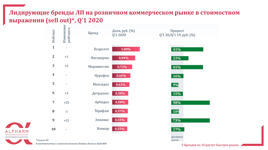 Среди лекарственных препаратов быстрее рынка выросли пять брендов: «Арбидол» (+98%), «Эликвикс» (+73%), «Ксарелто» (+41%), «Мирамистин» (+41%), «Ингавирин» (+22%).