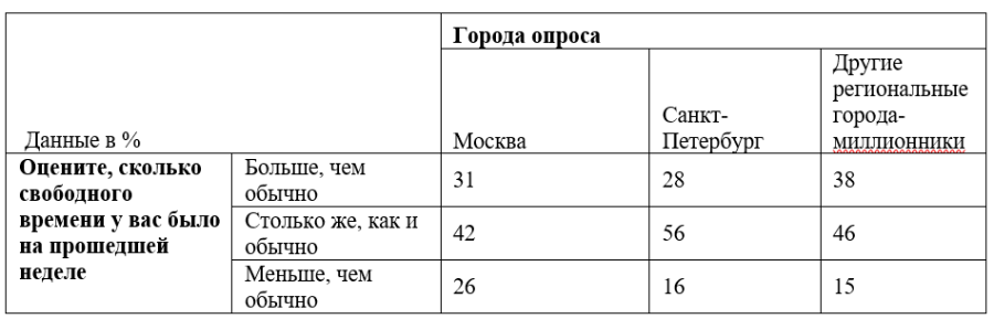 Исследовательская компания Wanta Group представляет данные об изменении образа жизни россиян в крупных городах. Эксперты отметили зависимость количества свободного времени у респондентов на неделе с 23 по 29 марта от их дохода. Чем выше доход респондентов, тем меньше у них свободного времени в период перехода к режиму самоизоляци.