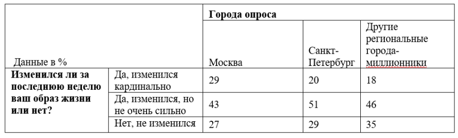 Кардинальные изменения в образе жизни в целом москвичи отмечают чаще, чем жители других городов (29% — Москва, 20% — Санкт-Петербург, 18% — регионы). Они же чаще других респондентов говорят, что свободного времени стало меньше (26% против 16% и 15% в Санкт-Петербурге и регионах соответственно). В Москве переход некоторых компаний на удаленный режим работы начался раньше, чем в других регионах, поэтому большую часть времени на прошлой неделе жители столицы посвятили организации дистанционной работы и закупкам продуктов питания. Подавляющее большинство (93%) респондентов из Москвы отмечают, что тратили свободное от работы время на покупки в магазинах или заказ продуктов через интернет.