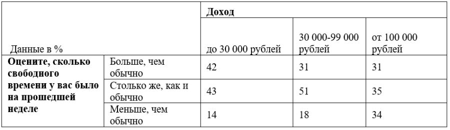 Респонденты с низким доходом (42% опрошенных — с заработком до 30 тыс. руб.) отметили увеличение свободного времени. Как правило, это наемные работники, чьи предприятия были закрыты в связи с распространением коронавируса, а также студенты и молодые люди, имеющие временные подработки (официанты, промоутеры, билетеры и т. д.). Освободившееся время респонденты посвящают просмотру фильмов (75%), занятиям спортом (59%).