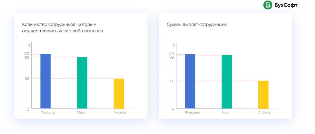 Количество физически выплаченных начислений (аванса, отпускных, больничных командировочных и пр.) сократилось еще больше — на 3% в марте к февралю и на 40% в апреле к марту.