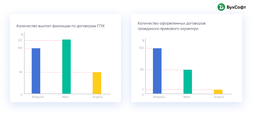 Компания «Бухсофт-Онлайн» провела исследование кадровой политики малого и среднего бизнеса в первом квартале 2020 г. В апреле компании из сегмента малого бизнеса в два раза сократили выплаты сотрудникам и в три раза — набор новых сотрудников по сравнению с февралем, а количество заключенных договоров с физлицами сократилось на 93%.