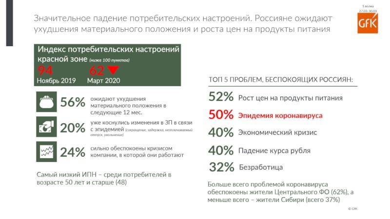 Городское население России остро реагирует на нынешнюю ситуацию с коронавирусом, который сломал привычный уклад жизни. По данным GfK, Индекс потребительских настроений в конце первого квартала 2020 г. упал до 62 пунктов. Это самый низкий показатель за всю историю мониторинга в стране, сообщила компания