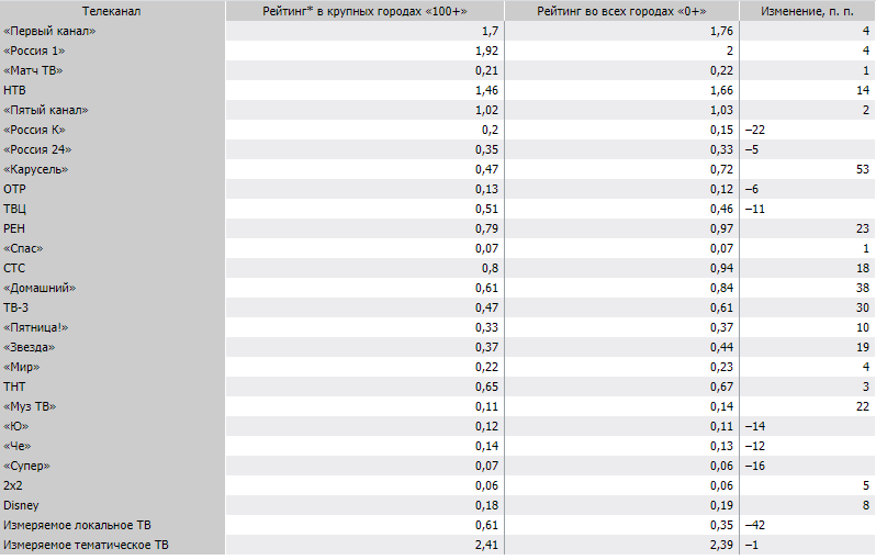 Двузначный прирост показателей рейтинга (среднее количество человек, смотревших телеканал, выраженное в процентах от населения) в процентах по итогам первого квартала 2020 г. был зафиксирован у НТВ, ТВ-3, «Пятницы!», СТС, «Домашнего», РЕН, «Муз ТВ», «Звезды» и «Карусели».