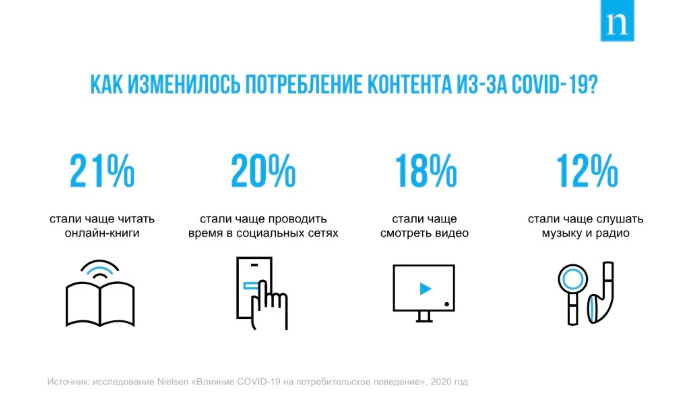 Больше всего — на 21% — увеличилось число тех, кто стал чаще читать онлайн-книги. Больше времени в соцсетях стали проводить 20% респондентов. На 18% выросло количество пользователей, потребляющих видеоконтент. 12% опрошенных стали чаще слушать музыку и радио.