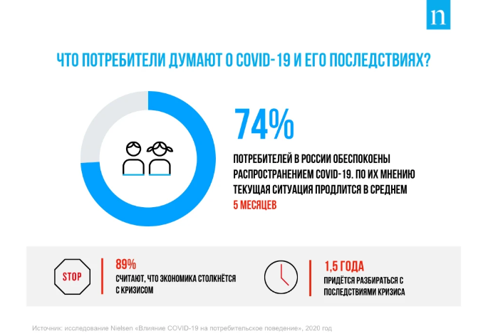 Что же касается среднесрочных перспектив влияния COVID-19, то большинство участников исследования Nielsen ожидают или уже столкнулись с его последствиями. Семи из десяти потребителей (69%) пришлось изменить планы путешествий. А 89% респондентов уверены, что COVID-19 окажет негативное влияние на экономику страны, с проявлениями которого придется разбираться в среднем около 1,5 лет.