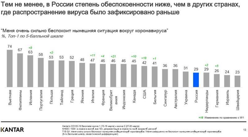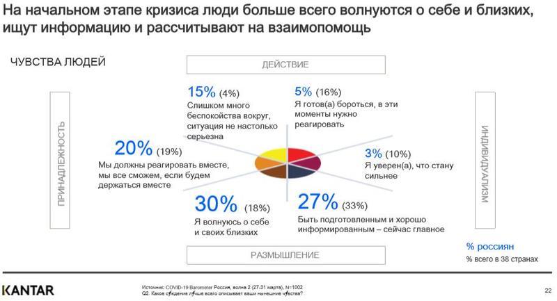 Общая степень волнения в России из-за ситуации с коронавирусом значительно ниже, чем в ряде других стран. В то же время 71% граждан РФ признались, что COVID-19 оказал влияние на их повседневную жизнь, о чем свидетельствуют результаты опроса исследовательской компании Kantar. Он был проведен с 27 по 30 марта среди 1 тыс. жителей российских городов 100k+ от 18 до 54 лет.
