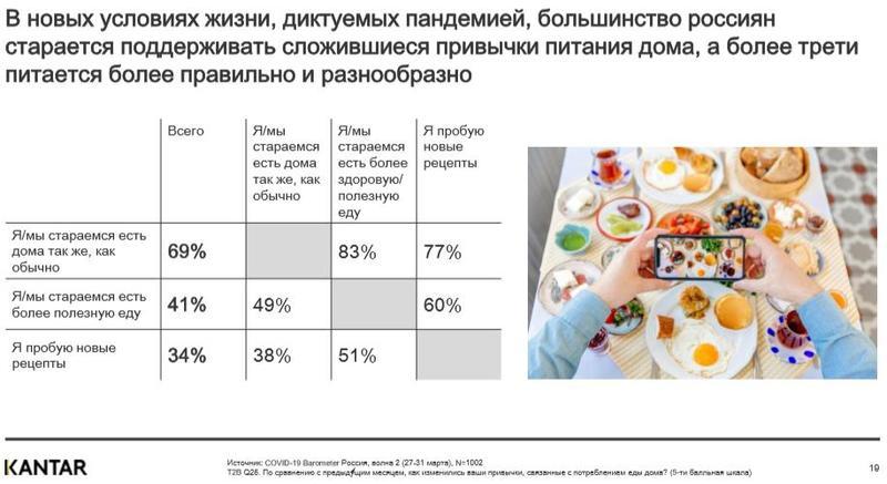 - Россияне начали приспосабливаться к новым условиям и к концу марта стали заказывать товары и продукты онлайн чаще, чем в предыдущем месяце, — об этом заявили 14% опрошенных. Многие (69%) стараются есть дома так же, как обычно, а большинство (83%) отдают предпочтение полезной пище.