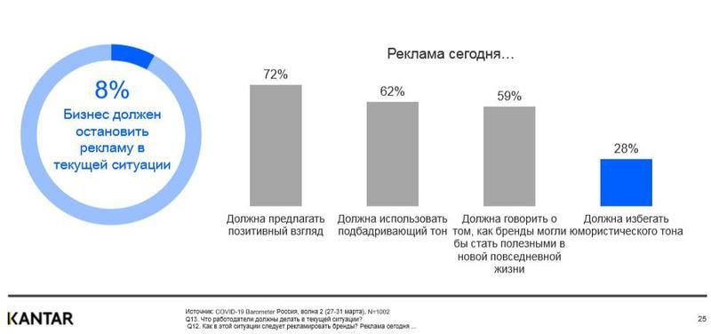 - Реклама, по мнению большинства респондентов, не должна прекращаться — с этим не согласны только 8%. Около 72% ожидают от нее позитивного взгляда, а 28% — отказа от юмористического тона.