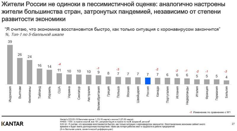 - Около 70% россиян заявили, что волнуются из-за ситуации с COVID-19, но о сильном беспокойстве сказали около 29%. Для сравнения, из-за пандемии значительно переживают 74% жителей Вьетнама — участников глобального опроса Kantar. Волнуются также около 50% респондентов из Франции и 48% из Японии. В США к концу марта о беспокойстве заявили примерно 60% опрошенных.
