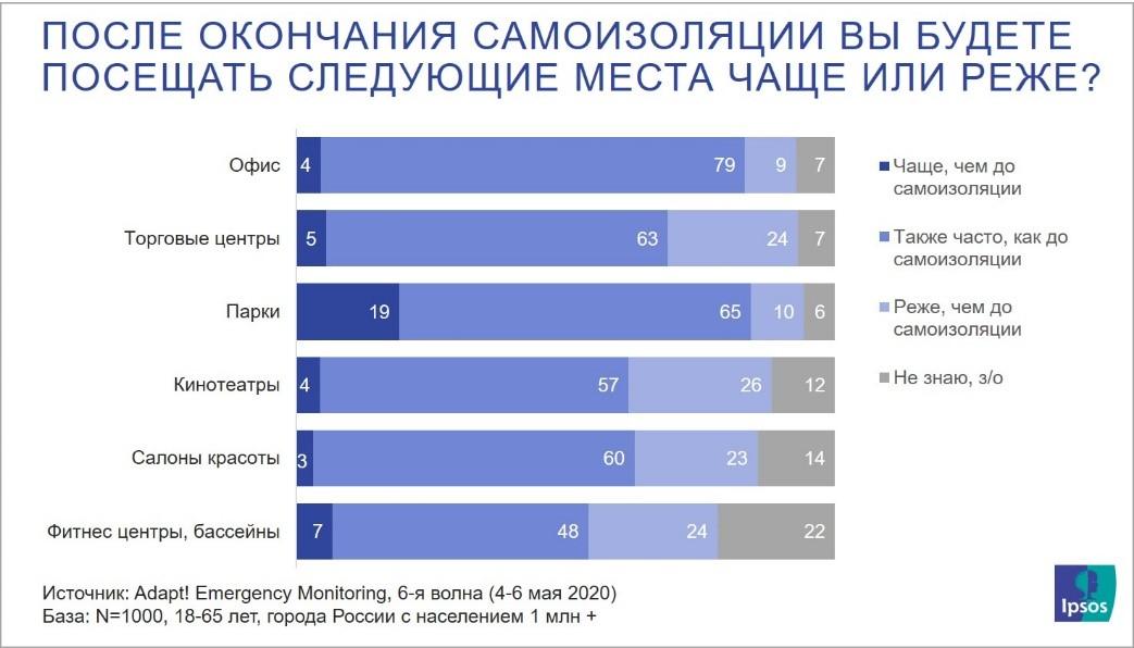 Ipsos опубликовала результаты шестой волны опросов Adpat! о поведении потребителей на фоне пандемии коронавируса. В рамках последнего мониторинга исследовательская компания узнала у россиян, какие места они планируют посещать чаще или реже после окончания самоизоляции.