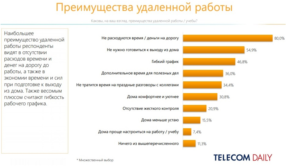 К основным преимуществам удаленной работы респонденты отнесли возможность не тратить время и деньги на дорогу до офиса — 80%, сэкономить время на подготовке к выходу из дома — 55%. Чуть меньше опрошенных отметили гибкость рабочего графика — 47%.