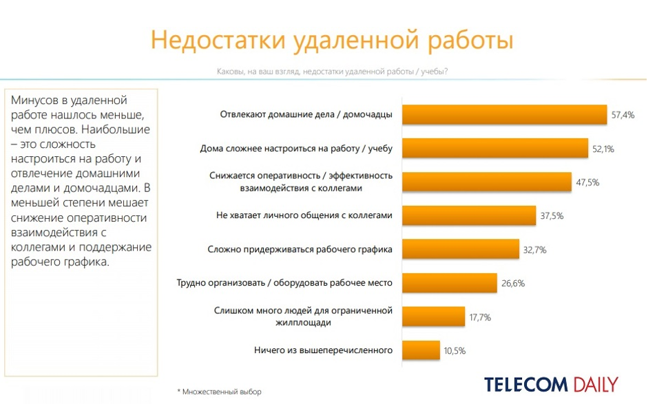 Недостатки удаленной работы оказались не так очевидны: ни один из вариантов ответа не набрал более 60% голосов. Чаще всего респонденты жаловались, что их отвлекают домашние дела или домочадцы — 57%. Для 52% сложность заключается в том, чтобы настроиться на работу. Почти 48% отметили, что дома снижается оперативность/эффективность взаимодействия с коллегами, еще 38% испытывает нехватку личного общения с коллегами.