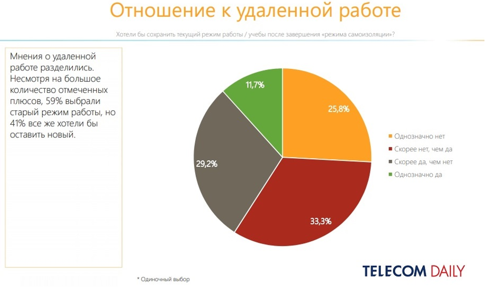 С окончанием режима самоизоляции большинство опрошенных желали бы вернуться к привычному режиму работы: однозначно за это высказались 26%, еще 33% предпочли бы именно такой вариант. Тем не менее 41% хотели бы продолжить работать из дома.