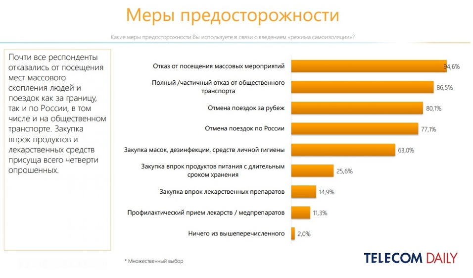 Большинство опрошенных согласны с тем, что опасность существует: почти 95% отказались от посещения массовых мероприятий, 87% перестали ездить на общественном транспорте полностью или частично. Отмена поездок за рубеж (80%) и по России (77%) — не только выбор граждан, но и составная часть ограничительных мер государства по противодействию распространения вируса. Закупать маски, средства для дезинфекции, средства личной гигиены принялись 63% опрошенных.