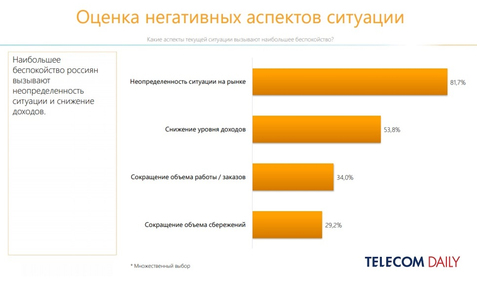 До 37% участников опроса полагают, что российское общество не сумело адаптироваться к ситуации, 20% думают наоборот, более 43% оценивают степень адаптации как нейтральную. Наибольшее беспокойство вызывает неопределенность ситуации на рынке (82%), снижение доходов почувствовали 54%. Сокращение объема работы и объема сбережений отметили соответственно 34% и 29%.