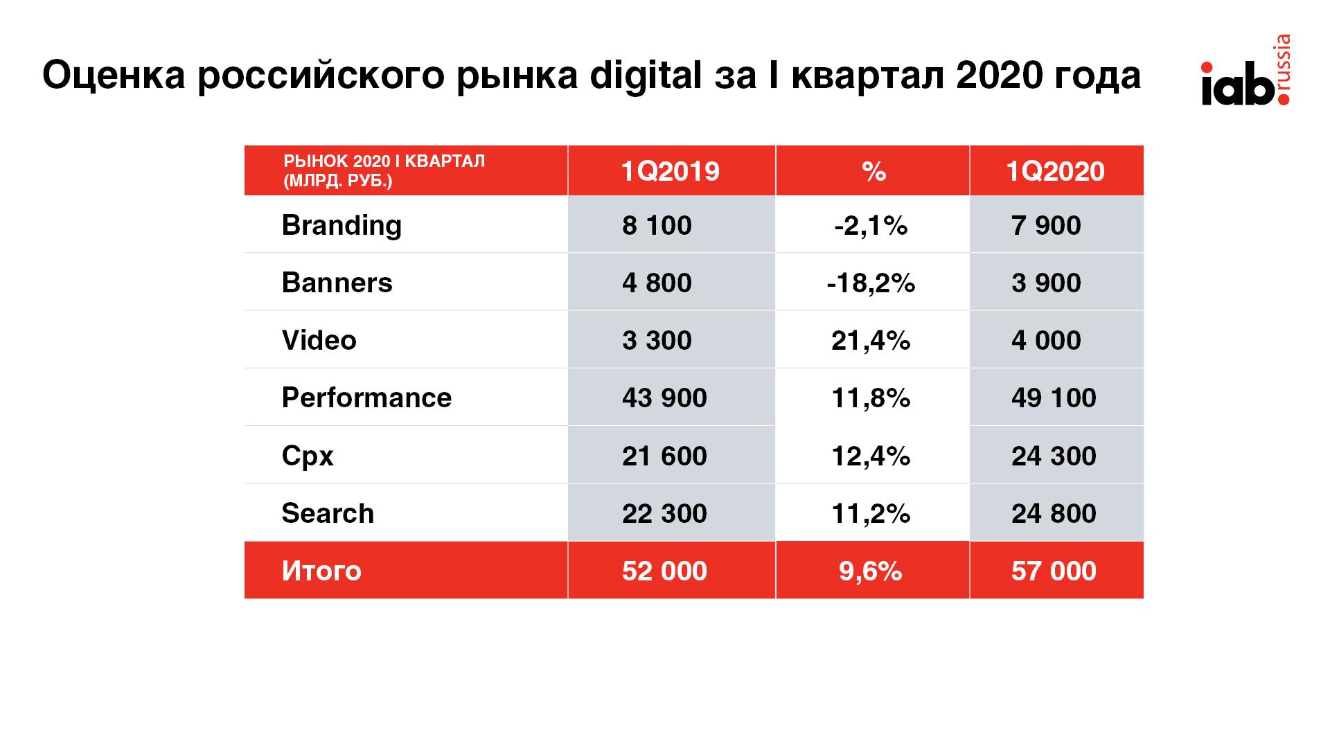 В январе — марте 2020 г. рекламный рынок России вырос на 4%, сообщила Ассоциация коммуникационных агентств России. Расходы рекламодателей на продвижение оценили в 115–116 млрд руб. Несмотря на скромную динамику, в абсолютных цифрах это самый успешный квартал за всю историю измерения рекламного рынка, заявил вице-президент АКАР Сергей Веселов. При этом в марте все сегменты показали либо отрицательную динамику, либо близкую к нулю.