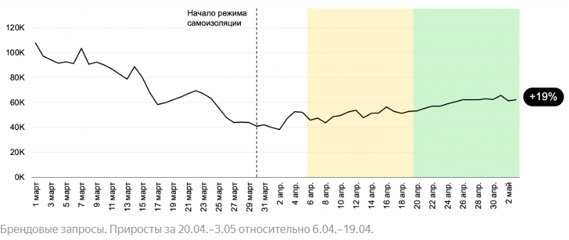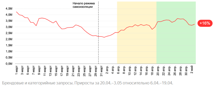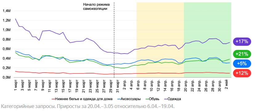 В марте компания наблюдала увеличение числа запросов на фоне гендерных праздников, за которым последовал спад пользовательской активности. Однако в последние две недели апреля россияне вновь стали искать модные товары. В «Яндексе» это объясняют желанием обновить гардероб перед окончанием самоизоляции.