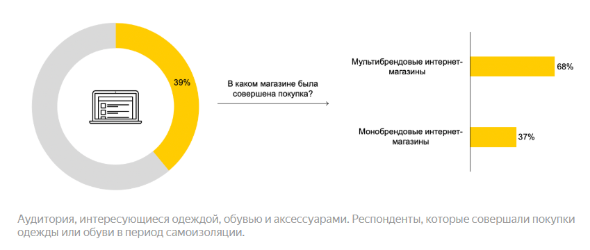 Основной площадкой для покупок стали мультибрендовые интернет-магазины — 39% опрошенных, которые делали покупки в период самоизоляции, совершали их в интернет-магазинах. Почти 70% покупателей предпочли широкий ассортимент от различных производителей, который предоставляют ритейлеры с множеством продавцов.