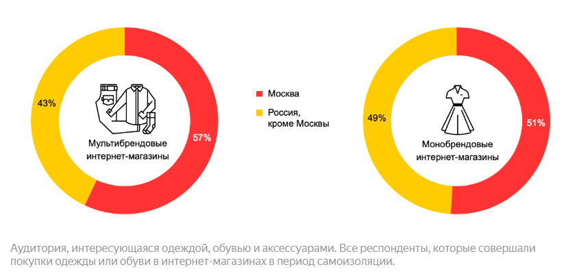 Жители Москвы чаще жителей других регионов совершали покупки в мультибрендовых интернет-магазинах (57%). Среди аудитории монобрендовых магазинов доля жителей Москвы и других регионов практически одинакова.