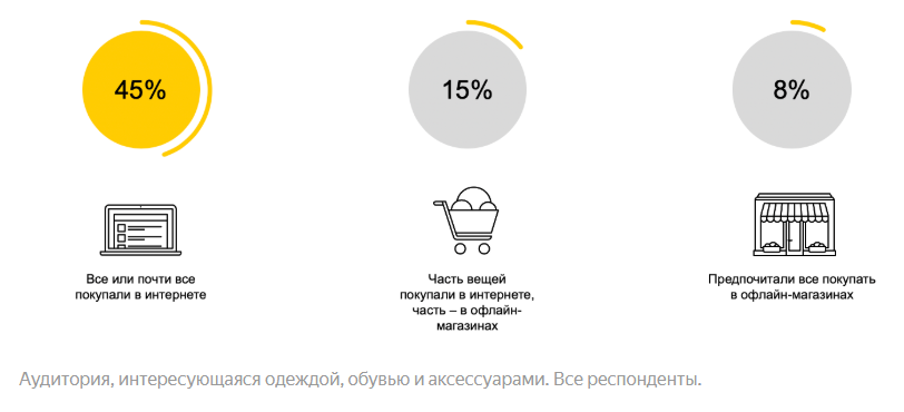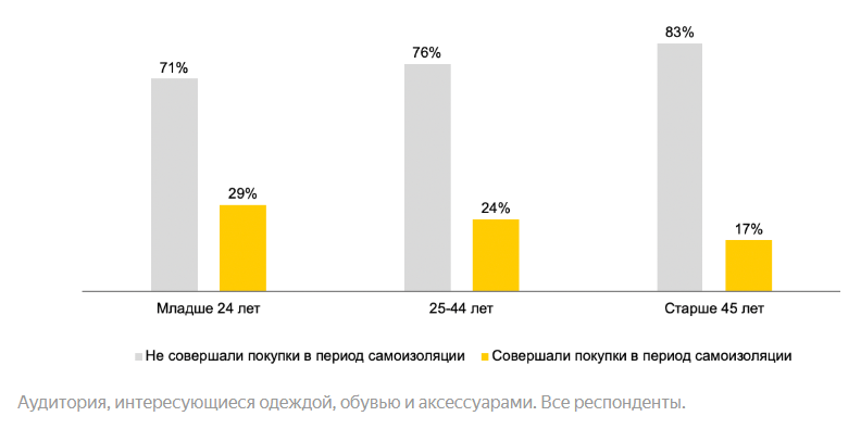 Несмотря на продолжение режима самоизоляции, люди строят планы на дальнейшие онлайн-покупки. Вероятно, влияет смена сезона и приближение периода распродаж, подчеркивают в «Яндексе». Среди тех, кто и ранее активно покупал в интернете, 45% собираются купить одежду или обувь до завершения самоизоляции. Такие же планы у 15% респондентов, которые до самоизоляции покупали одновременно в онлайн- и офлайн-магазинах. Среди клиентов физических магазинов совершить покупку онлайн планируют 8% опрошенных.