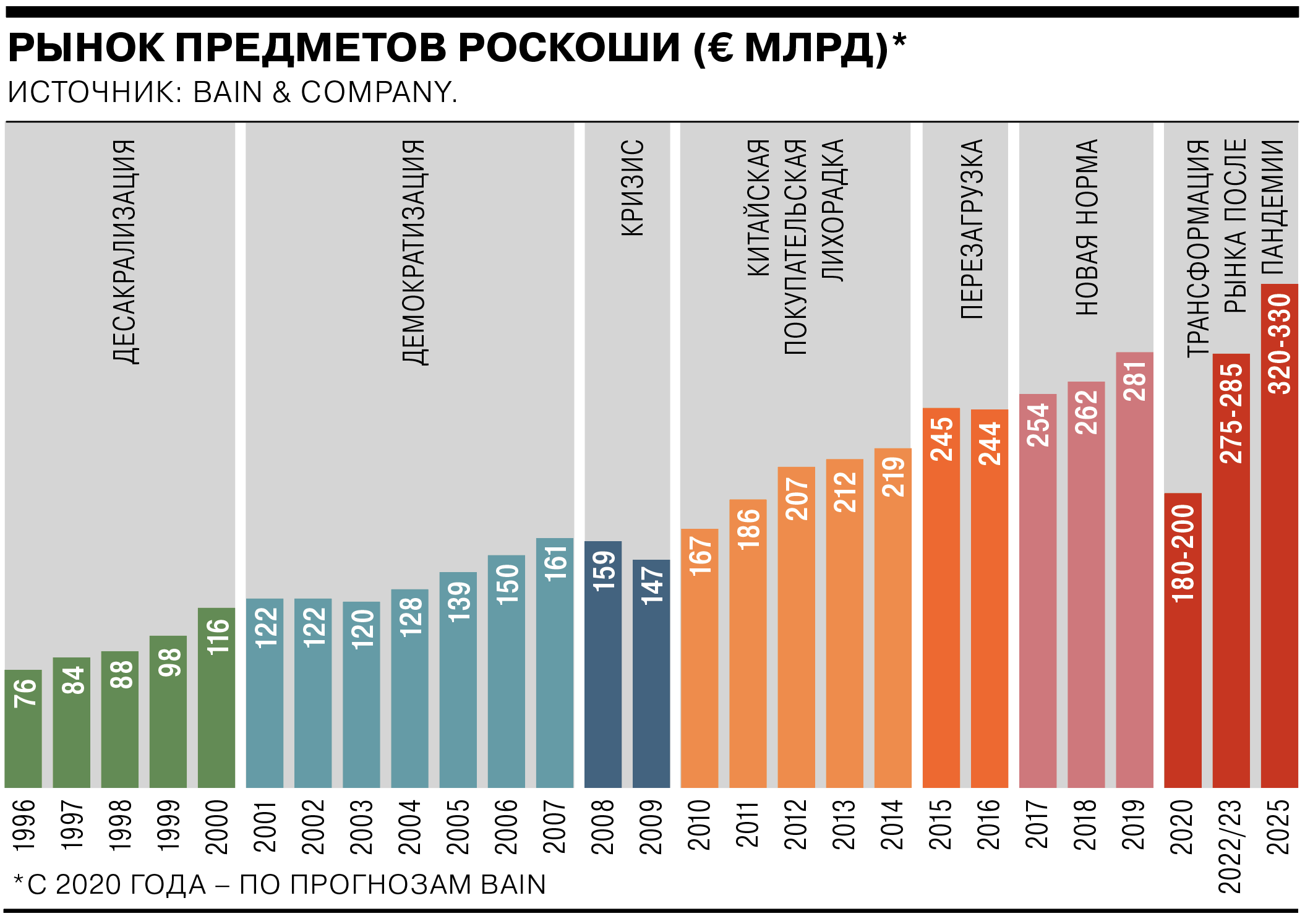 Объем мирового рынка предметов роскоши в прошлом году достиг €281 млрд, в нынешнем году он снизится до €180–200 млрд. В 2022–2023 гг. аналитики Bain ждут возобновления роста до €275–285 млрд, а к 2025 г. рынок достигнет €320–330 млрд.