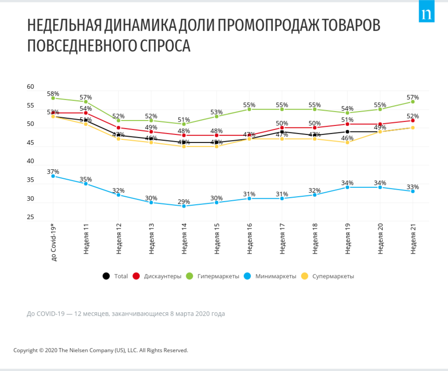 В Nielsen отметили еще один способ поиска дополнительной выгоды — скидки. В период ажиотажной закупки доля промопродаж снизилась и дала надежду на выход из сложившейся ситуации, когда более половины товаров FMCG продавались со скидками. Ближе к маю объемы таких продаж вернулись к докризисным значениям. В среднем 31% россиян стали чаще искать в магазинах товары со скидками. Эта доля выше среди потребителей, финансово пострадавших от пандемии, — почти 40% (38% в интернет-магазинах, 39% в офлайне).