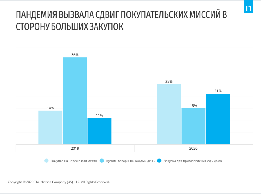 В 2019 г. наиболее частая миссия покупки звучала как «небольшая покупка товаров на каждый день», в сейчас наиболее популярными вариантами являются «закупка на неделю или месяц», а также «закупка для приготовления еды дома». Помимо этого, 20% потребителей ставили целью при посещении магазина пополнить запасы между большими покупками.