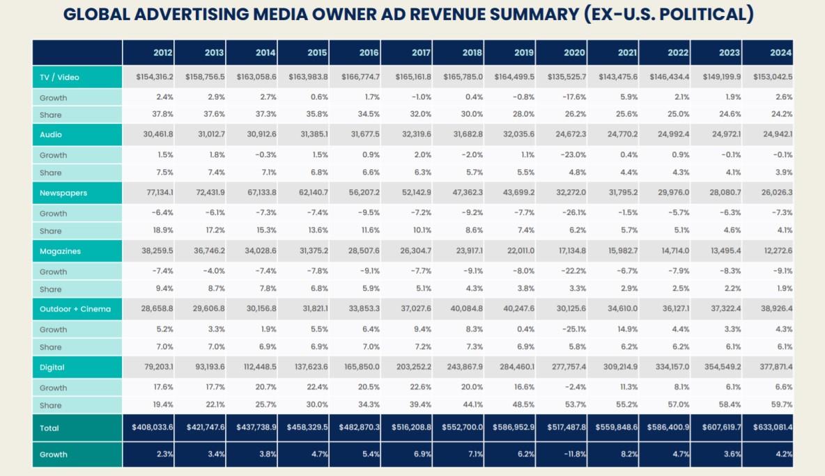 В последней версии прогноза This Year, Next Year рекламная группа начала оценивать цифровую составляющую (digital extensions) традиционных медиа. В 2020 г. на digital пришлось 13% рекламных доходов ТВ, радио, прессы и наружки ($31 млрд). Пять лет назад digital приносил им $22 млрд, или 7% от всех бюджетов. Наибольшая доля digital у наружной рекламы (31%, $9 млрд), тогда как на телевидении этот показатель составляет 9% ($12 млрд). К 2024 г., согласно прогнозам GroupM, цифровая среда обеспечит традиционным медиа 16% рекламной выручки.