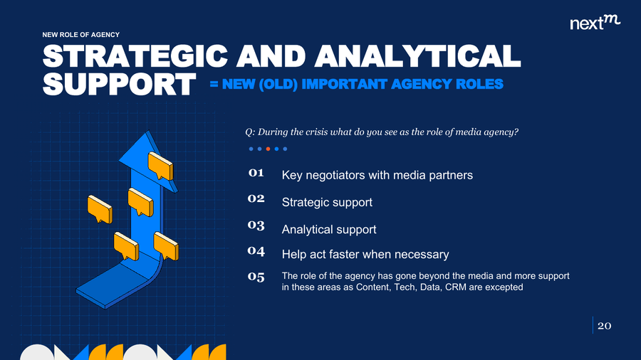 - Роль агентств за время пандемии существенно изменилась — так считают 34% опрошенных. В первую очередь они стали ключевыми переговорщиками с медиапартнерами, а также выросла роль стратегического и аналитического консалтинга со стороны агентств. Они также помогают своим клиентам действовать быстрее, когда это необходимо.