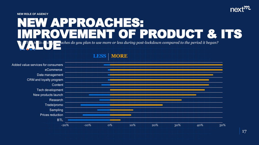 - Больше, чем до пандемии, участники опроса собираются обеспечивать дополнительные ценности продукта для потребителей, развивать e-commerce и работу с данными. Меньший упор респонденты будут делать на BTL-активности и снижении цен.