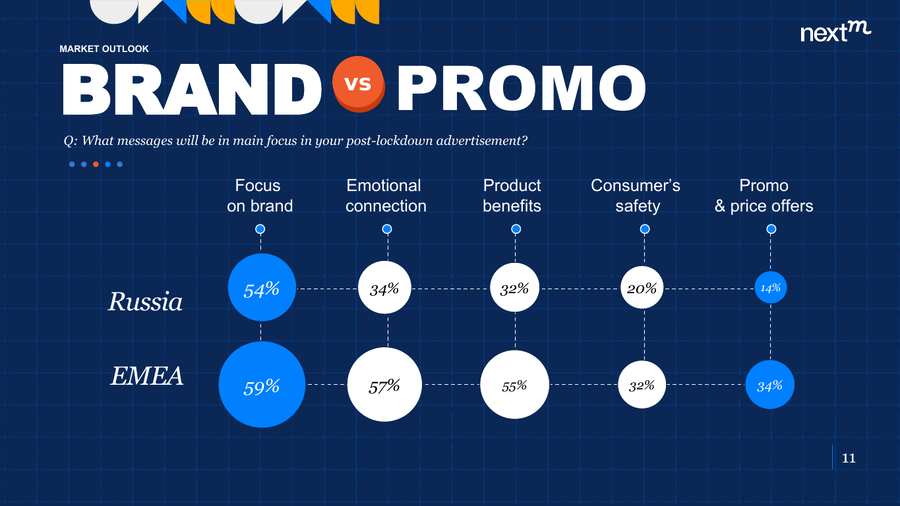 - Бренды планируют увеличить затраты на digital-каналы, наиболее популярные из них — e-commerce (61%), соцсети (48%) и онлайн-видео (41%). А в коммуникации участники рынка будут делать упор на самом бренде (54%), эмоциональной связи с потребителем (34%), а также на продуктовых преимуществах (32%). Планируется гораздо меньше промо, чем в EMEA (14% против 34%). Это говорит о том, что рынок собирается выходить из «промогонки», которая не дает положительных результатов.
