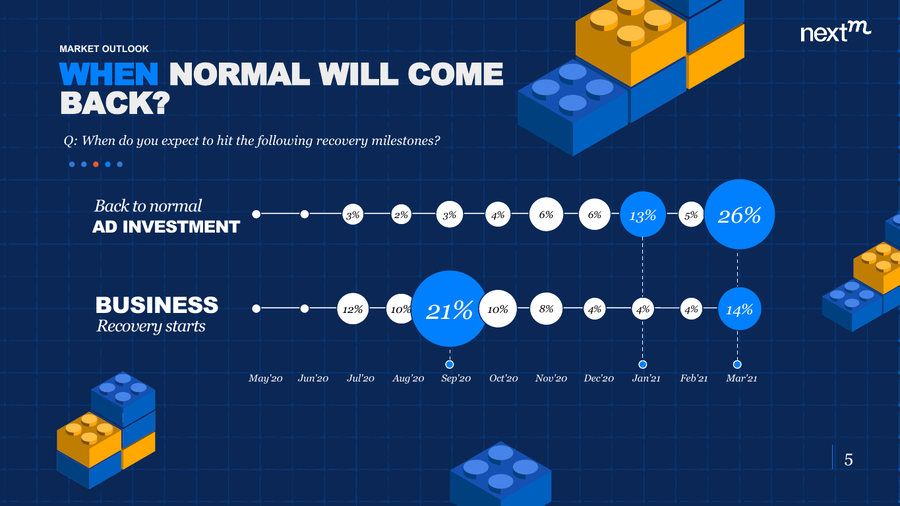 - Бизнес в России начнет восстанавливаться в сентябре 2020 г., а рекламный рынок — в первом квартале 2021 г., считают респонденты. Большинство (26%) ожидают, что подъем придется на март, а 13% рассчитывают увидеть восстановление уже в январе.