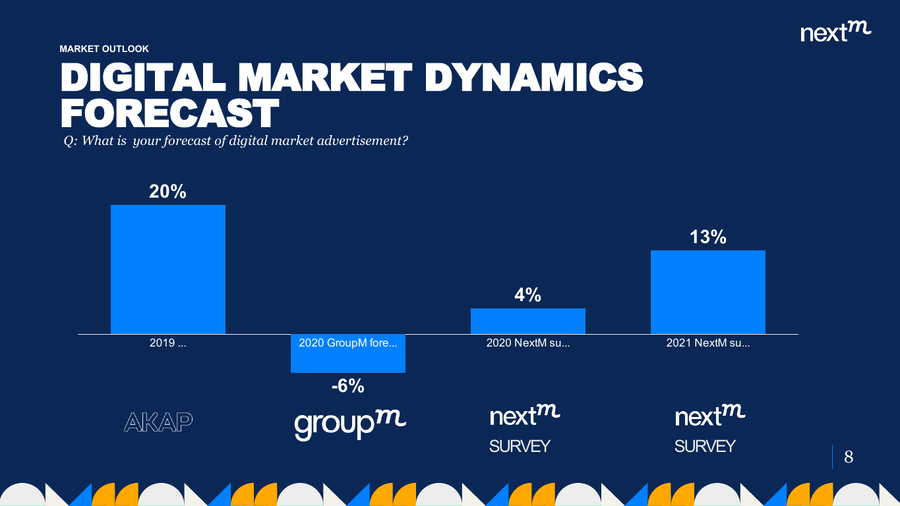 - Согласно прогнозу GroupM, озвученному ранее, падение рекламного рынка в России в 2020 г. составит 11%, при этом digital упадет меньше всех (-6%). Игроки рынка настроены более оптимистично: они считают, что интернет как медиаканал покажет рост на 4% в 2020 г., а в 2021 г. — на 13%. Особенно позитивно в отношении digital настроены представители телеком-сферы, ритейла и фармацевтической отрасли.