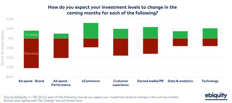 Как показал опрос, в первую очередь компании готовы отказаться от инвестиций в бренд (-62%) и в performance (-41%). Зато eCommerce и технологии ждет ощутимая прибавка. Заметное увеличение прогнозируется в отношении earned media/PR, но негативные настроения здесь все же преобладают.