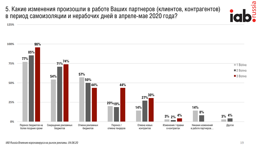 - Увеличилось и количество респондентов, отметивших сокращение рекламных бюджетов — на 20 п. п. к марту. Также выросло количество опрошенных, обративших внимание на отмену и перенос тендеров — на 25 п. п.