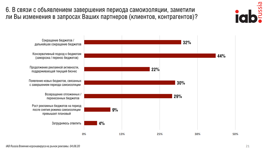 В мае 44% опрошенных IAB Russia заметили, что рекламодатели переносят или замораживают бюджеты. О возвращении ранее перенесенных бюджетов заявили 26% респондентов, еще 22% отметили продолжение рекламной активности в пределах сумм, запланированных до кризиса.