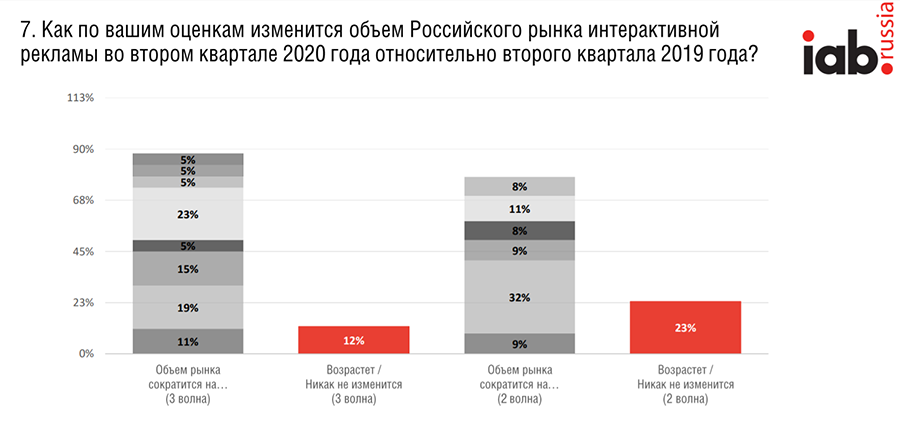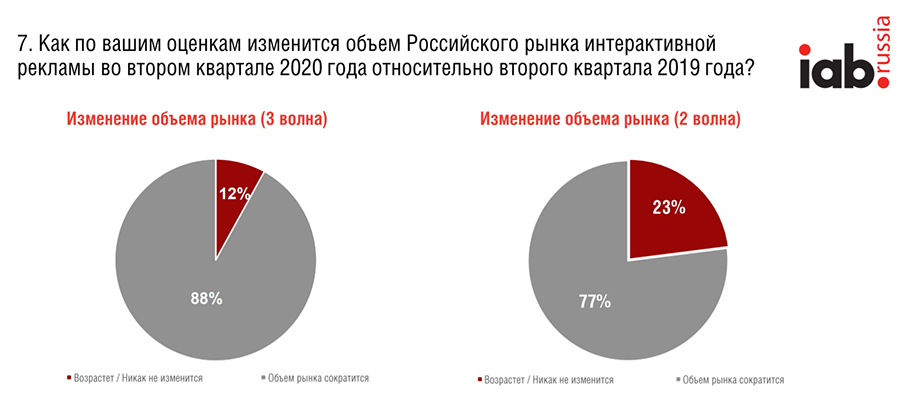 - Большинство опрошенных (88%) сошлись во мнении, что объем рынка интерактивной рекламы в апреле — июне сократится к прошлому году. С апреля количество таких респондентов выросло на 11 п. п. Из них 30% прогнозируют падение на 30%.