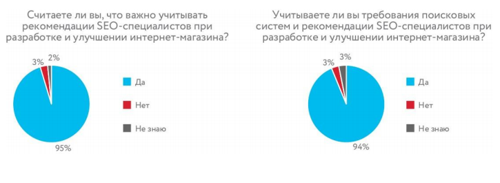 Большинство опрошенных (95%) считают, что важно учитывать рекомендации SEO-специалистов при разработке и улучшении интернет-магазинов. Принимают во внимание рекомендации SEO-специалистов 94% участников.