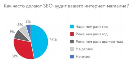 Больше половины (53%) участников опроса проводят SEO-аудит интернет-магазинов реже, чем раз в год. При этом доля участников, которые отметили рост продаж и посещаемости, выше в группе, которая проводит аудит чаще, чем раз в год, — 55% против 39%.
